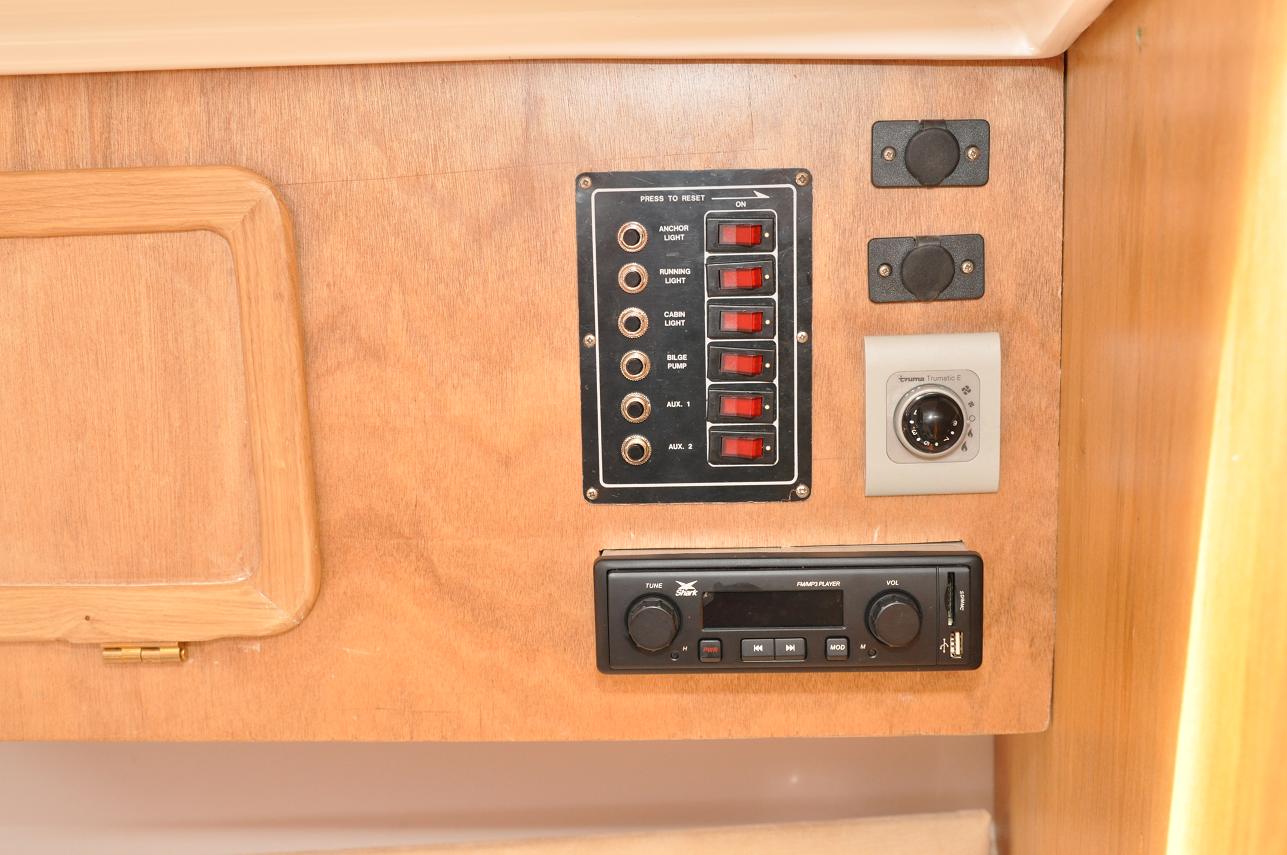 Wyposażenie dodatkowe: bramka do kladzenia masztu, sztywny sztag, roll fok, lazzy jack, instalacja wody - zbiornik, radio, mp3, TV, DVD, lodówka, ogrzewanie, instalacja 230 V